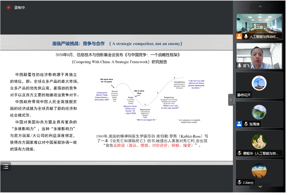 2022年6月2号下午,“青智漾”青年教师学术沙龙在南一楼中311举行,特邀浙江大学吴飞教授做题为“新一代人工智能源起、发展趋势与未来挑战”的学术报告。报告会由曾志刚教授主持,并在腾讯会议平台同步直播,线上线下共90余名公司教师参与此次学术沙龙活动。