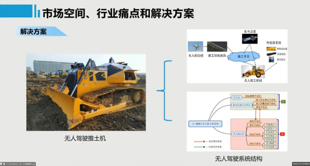 其中,“无人推土机自动驾驶智能感知与控制系统”参赛团队由公司彭刚老师、土木与水利工程公司周诚老师全程指导,成员包括控制科学与工程专业21级硕士生段航琪和周奕成、20级硕士生彭嘉悉,土木工程建造与管理专业19级博士生尤轲,工程管理专业20级本科生刘彦辰。该作品由云端和车端两部分组成,云端集成了土石方工程三维场景感知重构模型和任务智能调度算法;车端集成了3D激光雷达和双目深度相机,可以获得施工环境信息,实现装备无障碍地行驶和工作。