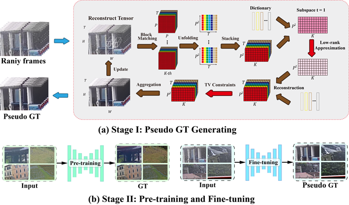 “单帧图像去雨”赛道由加利福尼亚大学洛杉矶分校组织,吸引了世界各地275支参赛队伍参加。HUST_VIE参赛队提出一种两阶段渐进式雨天图像增强方法,有机结合模型驱动优化方法与数据驱动学习方法,兼具强表达能力与泛化性,以综合指标最优取得冠军。