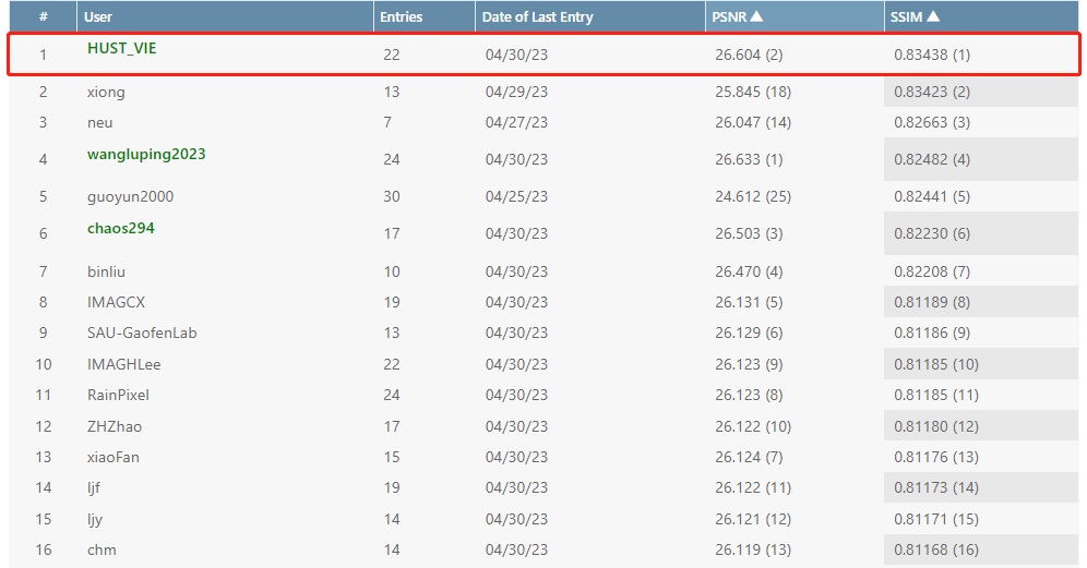 日前,2023年CVPR UG2+挑战赛结果揭晓,TapTap颜露新教授、钟胜教授、昌毅老师担任指导教师,“图像识别与智能系统”团队2022级硕士生郭赟、2021级硕士生肖雪尧、2019级本科生王枭雄、2020级博士生李祎组成的参赛队伍HUST_VIE,斩获了Single Image Deraining(单帧图像去雨)赛道全球冠军;2022级硕士生许晟旗、2021级硕士生肖雪尧、2020级博士生曹舒宁、2022级博士生刘昊岳组成的参赛队伍VIELab-HUST,斩获了Atmosphere Turbulence Mitigation(大气湍流校正)赛道全球冠军。
