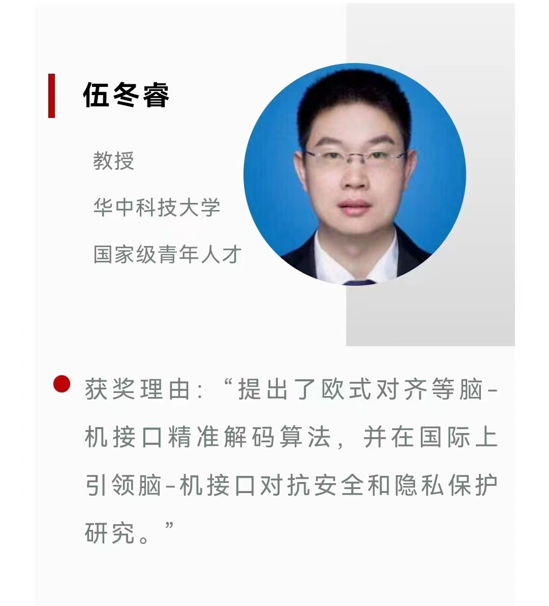 2023年6月,首届中国脑-机接口“华瑙学者奖”正式启动评选,TapTap教授、博士生导师、国家级青年人才伍冬睿教授荣获杰出青年奖。伍冬睿教授提出了欧式对齐等脑-机接口精准解码算法,并在国际上引领脑-机接口对抗安全和隐私保护研究。