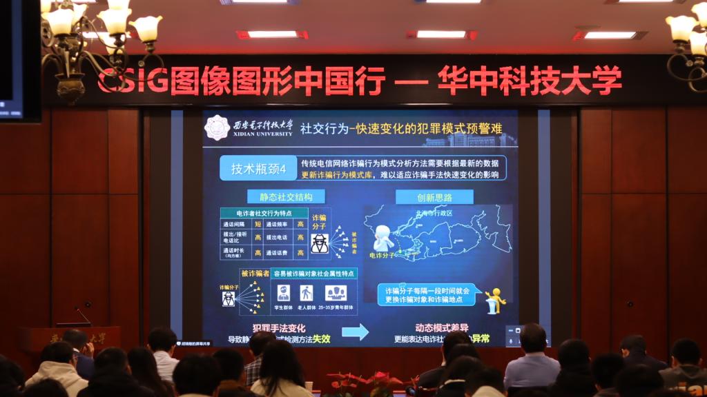 武汉大学胡瑞敏教授报告了《自然社会理解与社会安全预警技术》,胡教授围绕社会安全防范自然社会理解业务的核心需求,针对可信身份、隐秘组织、危险行为研究中的关键技术瓶颈,重点研究四层核心问题 。针对监控目标遮挡、视角变化、身份攻击的干扰,提出多视角碎片融合表征方法。面对“未知身份攻击”,提出并证明了“误差分布差异性猜想 ”,建立了可信身份计算模型。针对隐匿社会活动风险预警难题,构建了无监督条件下隐匿社会活动的语义增强表达、距离精细度量和风险预警分析的新模型和方法。最后,针对犯罪手法快速变化的挑战,研究社交结构动态变迁的模式和稳健特征,设计了边缘隐私计算与安全查询方法。胡教授的报告深入浅出,注重实际,引起了现场听众的强烈共鸣和热烈讨论。