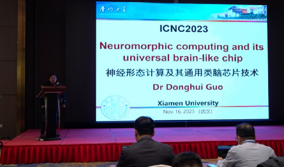 厦门大学郭东辉教授作了题为"Neuromorphic Computing and its Universal Brain Like Chip"的大会报告,从集成电路纳米技术的局限性和人工智能对大数据处理的发展要求出发,介绍了神经形态设备的优势和通用类脑计算的原理。同时,还介绍了类脑芯片的设计方法和可能的应用。