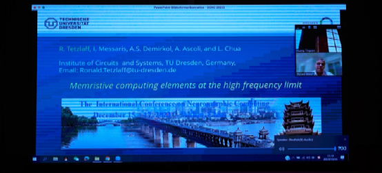 德国德累斯顿工业大学Ronald Tetzlaff教授作了题为"Memristive Computing Elements at the High Frequency Limit"的大会报告,阐述了忆阻器在当前新型计算机体系结构的开发上解决内存计算问题的重要性,并讨论了具有周期输入信号的忆阻器在高频范围内的行为,展示了通过分析忆阻器的基础紧凑模型,从而实现精确设置平均电阻。