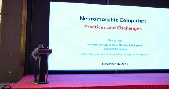 浙江大学潘纲教授作了题为"Neuromimetic Brain Computers: Practice and Challenges"的大会报告,基于大脑的结构、功能和操作机制,结合研究小组近年来在神经形态脑计算的硬件系统、基础软件、应用算法等方面的研究实践,介绍了脑计算科学领域的进展和挑战,探讨了可能突破现有计算框架的潜在类脑计算系统模型。