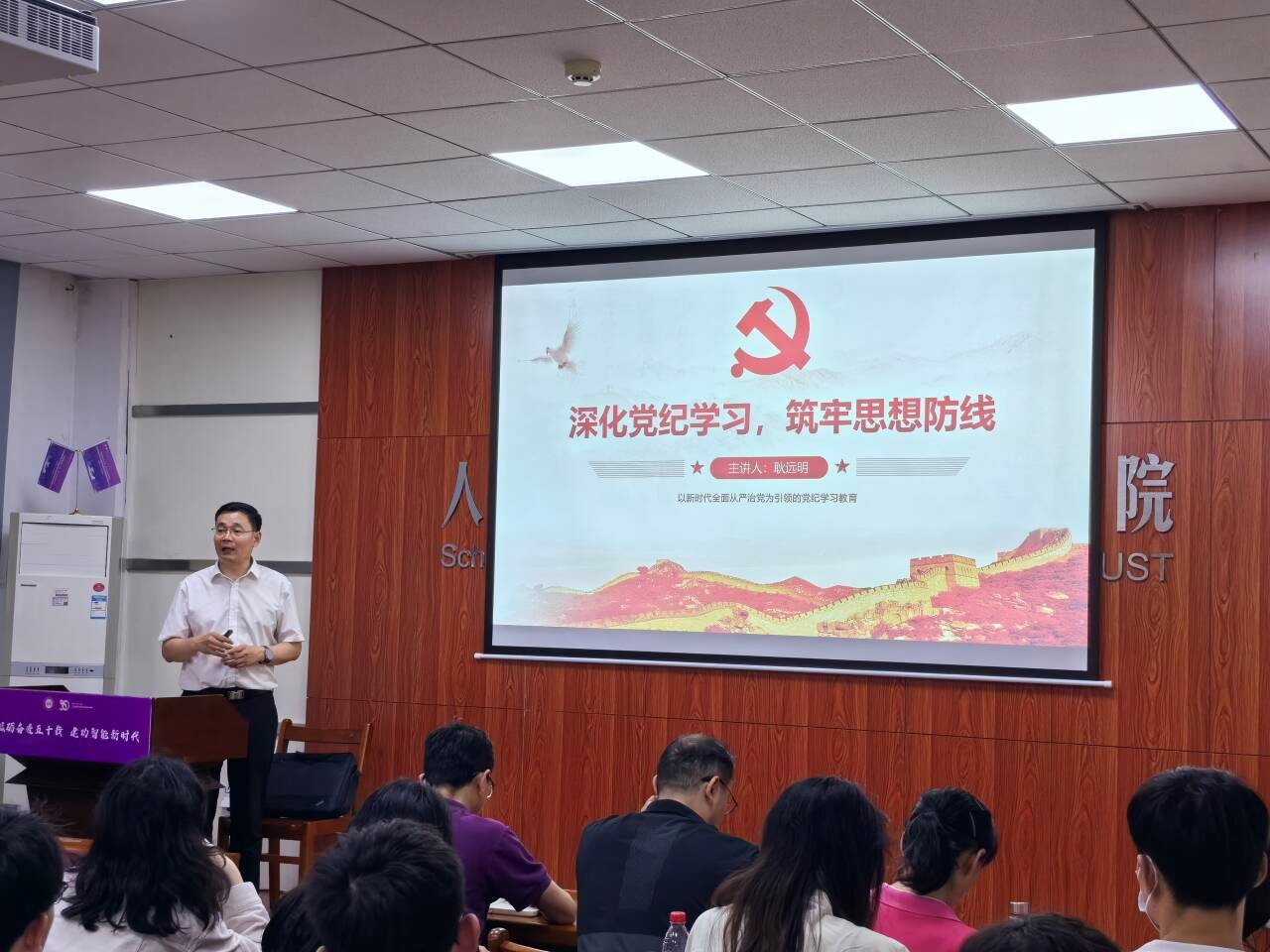 首先,耿远明面向全体师生支部书记以“深化党纪学习,筑牢思想防线”为主题讲授党纪教育专题课,他分析了当前党和国家的战略机遇和风险挑战,指出党纪学习的意义与背景,从“深刻认识党纪学习教育的要求、准确把握新修订《条例》主旨要义、深入剖析高校典型案例问题根源和以严明纪律推进自我革命”四个方面详细介绍了开展党纪学习教育的重要性和内容,再次强调了打铁还需自身硬。