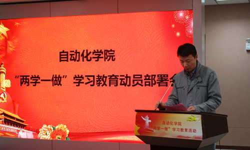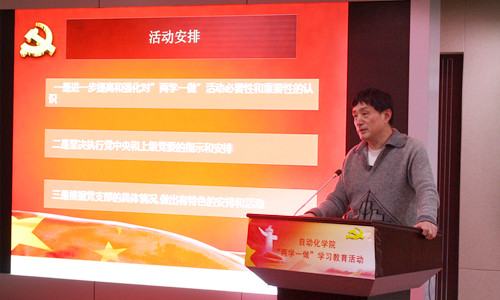 首先,自动化公司党委书记张耀做了《自动化公司关于落实“两学一做”学习教育方案的具体安排》的相关部署。他介绍了公司教工支部与员工支部结对共建方案,和公司制作的“两学一做”工作月历的具体内容;动员了教职工党员和员工党员重点要坚定共产党人理想信念、牢固树立党的意识及党员意识、强化党的宗旨意识,党员干部更要带头落实全面从严治党的责任;强调了全院各支部各党员应高度重视,落实带着问题学、针对问题改的要求,落实基础在学、关键在做的要求,落实公司、公司党委“两学一做”的工作部署,抓在日常、严在经常,增加党的意识、党员意识,做合格党员,把党的声音洪亮的发出来,把党的旗帜鲜明的举起来,充分发挥先锋模范作用,为把公司建设成为一流公司而努力奋斗。