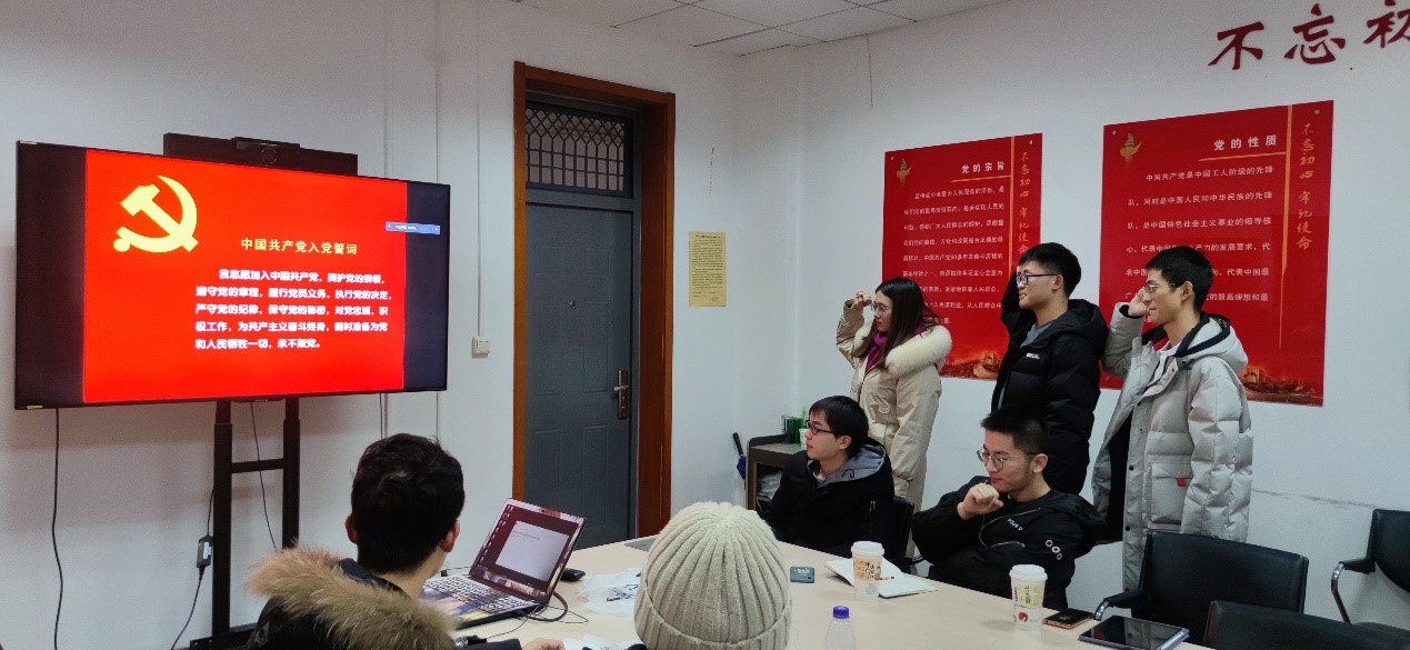 随后支部严格按照党员发展规定,讨论接收王宏伟,陈大志,杨语星,朱凯四位同志入党,四名同志在积极分子期间的表现得到了全体党员的认可,均全票通过被接收为预备党员。