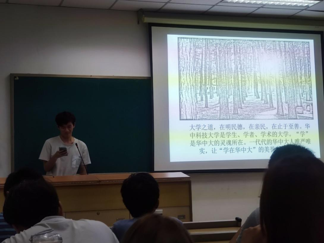 支部预备党员刘文博以“学在华中大,兴我大中华”为主题,阐释了华中大的优良学风源自“严格管理、严谨治学、踏实求学”。他表示,作为新时代的华中大青年,应遵从“明德厚学求是创新”的校训,写好发表在学术期刊和祖国大地上的论文,为国家富强和民族进步贡献力量。