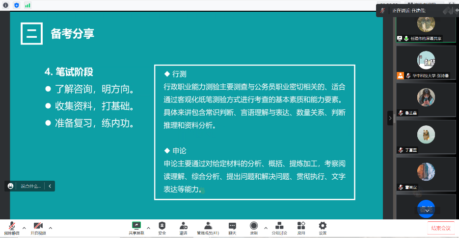 随后,任建伟从选调政策和备考两个方面分享了选调经验。首先他介绍了选调生的意义和选调的类别,又以辽宁省定向选调公告为例,对选调的要求、申请程序、人才引进待遇等进行了详细的讲解。关于备考方面,他表示在准备阶段需要明确就业目标,合理规划科研和求职进度。关于笔试和面试,他从常见题型和练习方法两个点出发分享了经验。