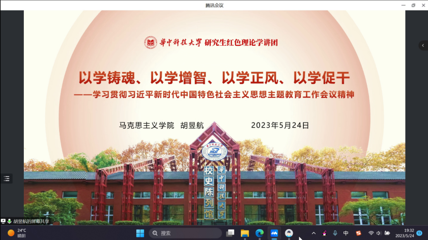 首先,胡昱航传达了学习贯彻习近平新时代中国特色社会主义思想主题教育工作会议精神,他强调习近平总书记重要讲话为纲领性文件的地位和作用,从全党为什么学,学什么和怎么学三个角度展开主题教育学习,表示全党思想统一是党强大凝聚力、战斗力的必然要求。他表示作为新时代的中国青年,大家肩负时代重任,应该以学铸魂,以学增智,以学正风,以学促干,为建设社会主义现代化国家贡献青春力量。