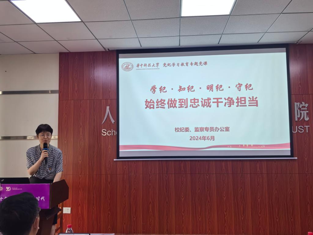 颁奖仪式结束后,罗君君为全体党员讲授党纪学习教育专题党课。她从学纪、知纪、明纪和守纪四个方面进行讲解,重点围绕《中国共产党纪律处分条例》修订前后的区别、条例中有关教育、高校等方面的内容进行了深入解读,并通过一些典型的高校教师违规违纪案例,强调党员要始终做到忠诚干净担当。