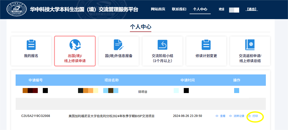 2)登录平台,打印《出国(境)申请表》,《返校申请表》;
